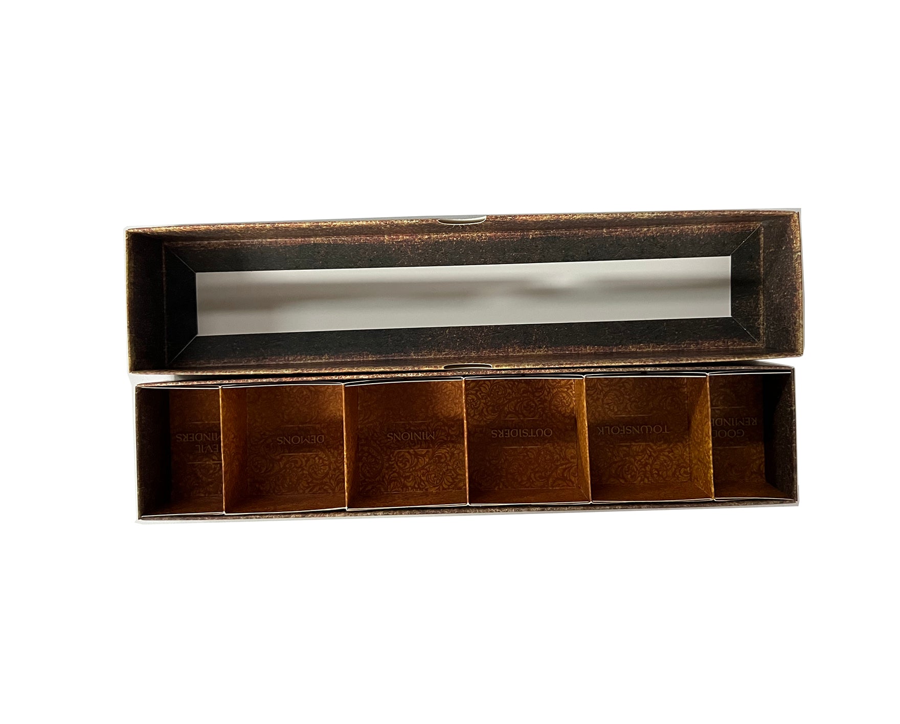 Narrow box partitioned into six sections. 'Bad Moon Rising' logo and text on top of box. Internal box tray coloured dark gold.