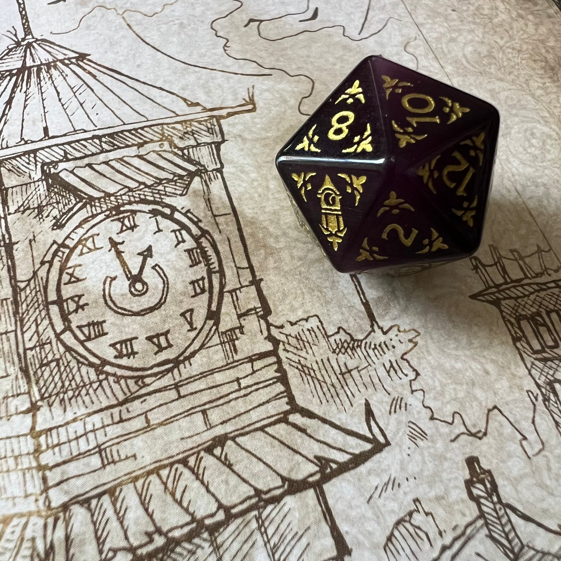 This luxurious set of purple cat’s eye dice is imbued with shimmering purple hues, catching the light beautifully as they roll. Each die is inked in gold and features a unique Blood on the Clocktower design on its highest face, making this set as striking as it is special.